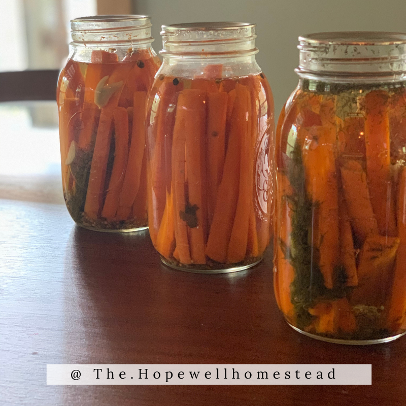 - Let Jars sit in VERY hot water for some time. This reduces breakage when vinegar (pickling solution) is added, and when jars are added (later) to water bath.